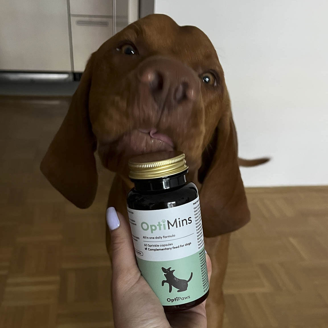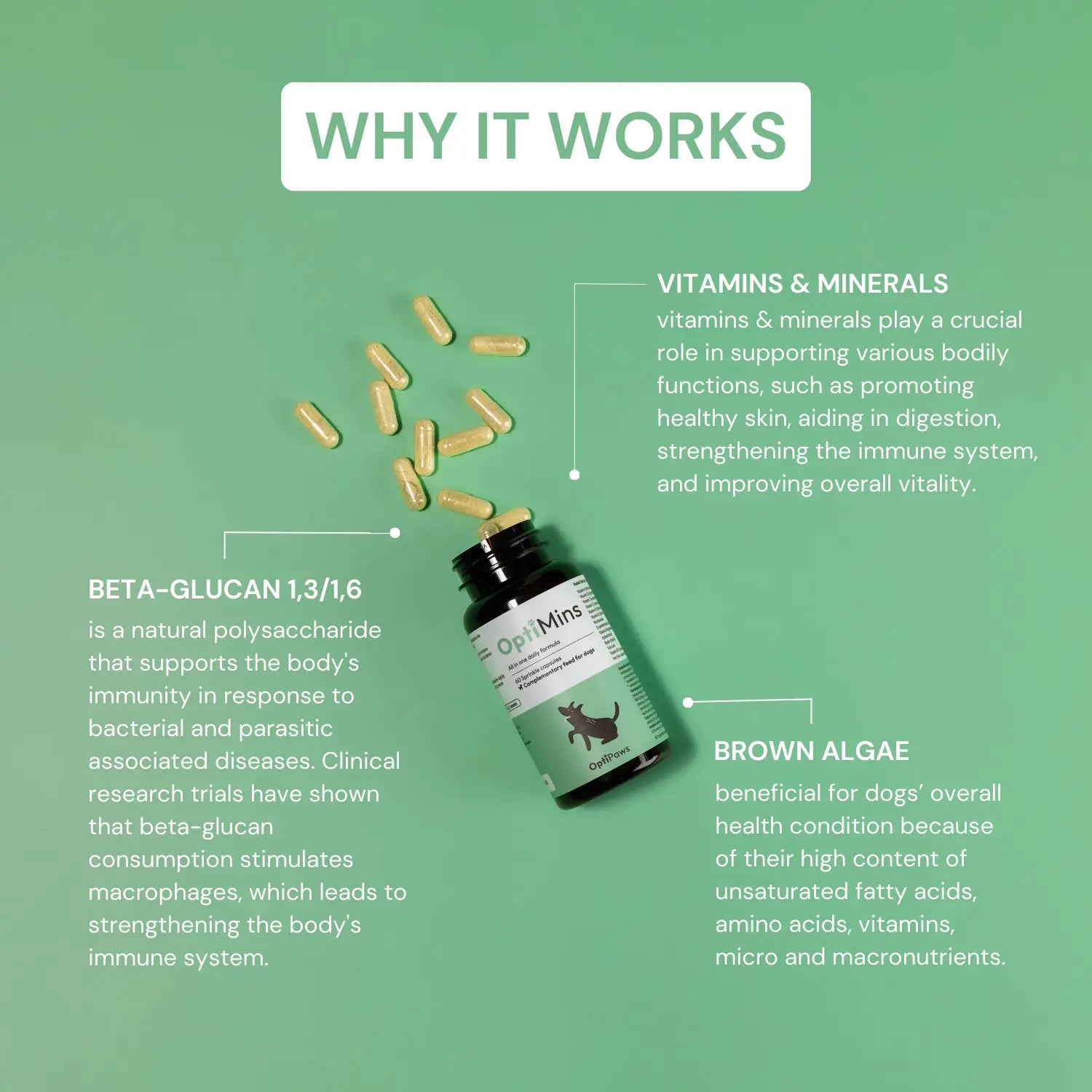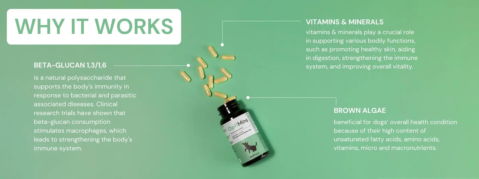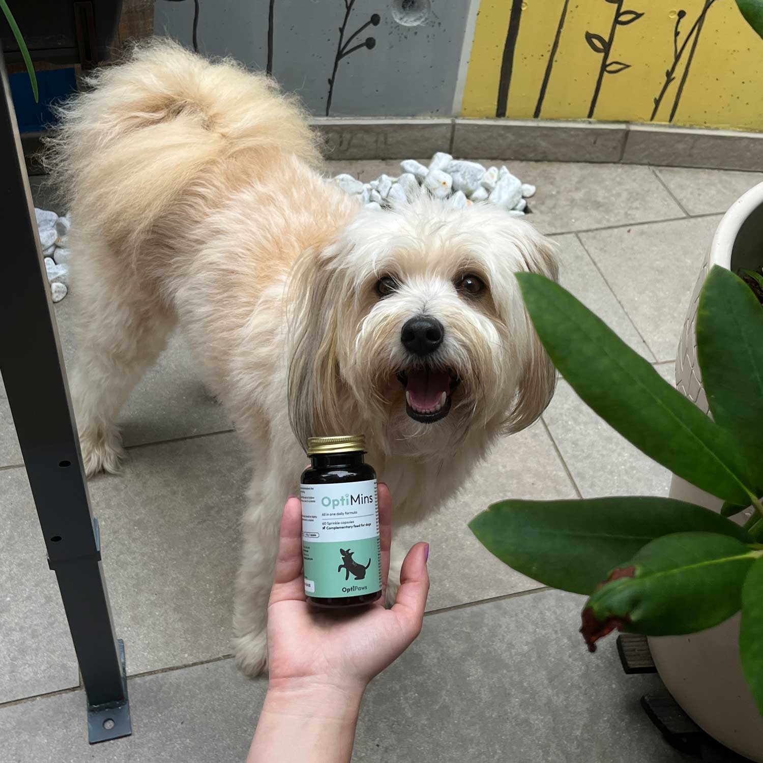 OptiMins is a carefully balanced set of vitamins, minerals and antioxidants that work great as a daily support to the immune system of your dog.